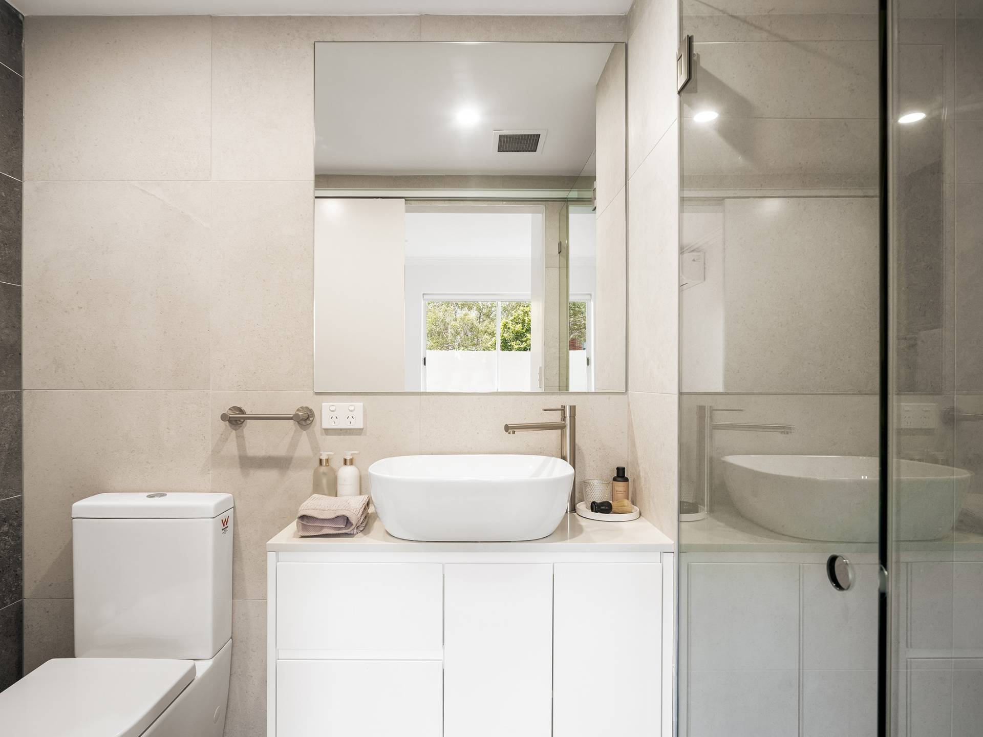 · Stylish bathroom, floor-to-ceiling stone-hued tiles