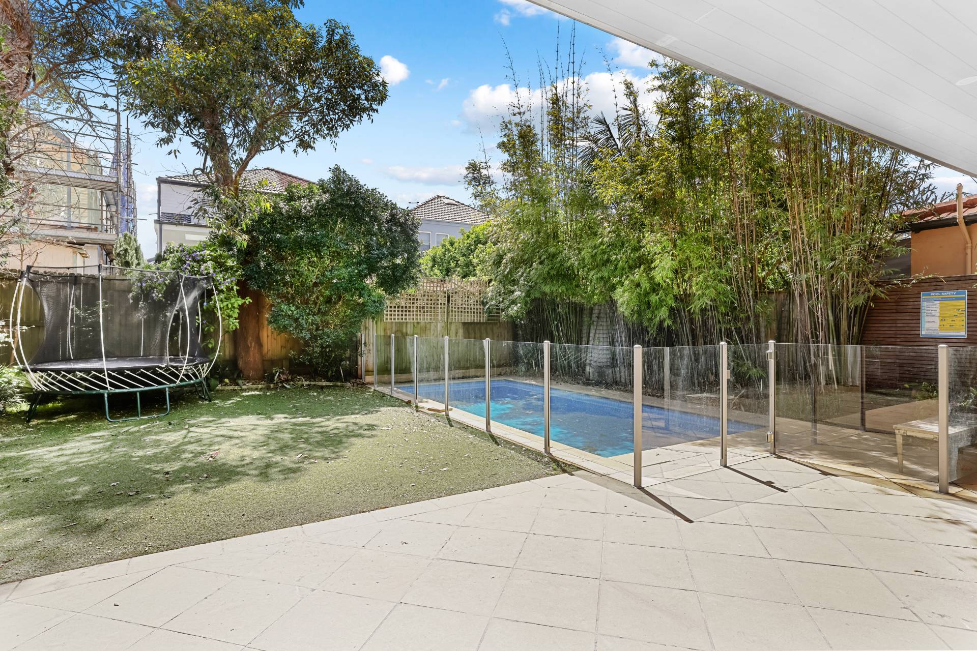 -Low-maintenance backyard with heated swimming pool