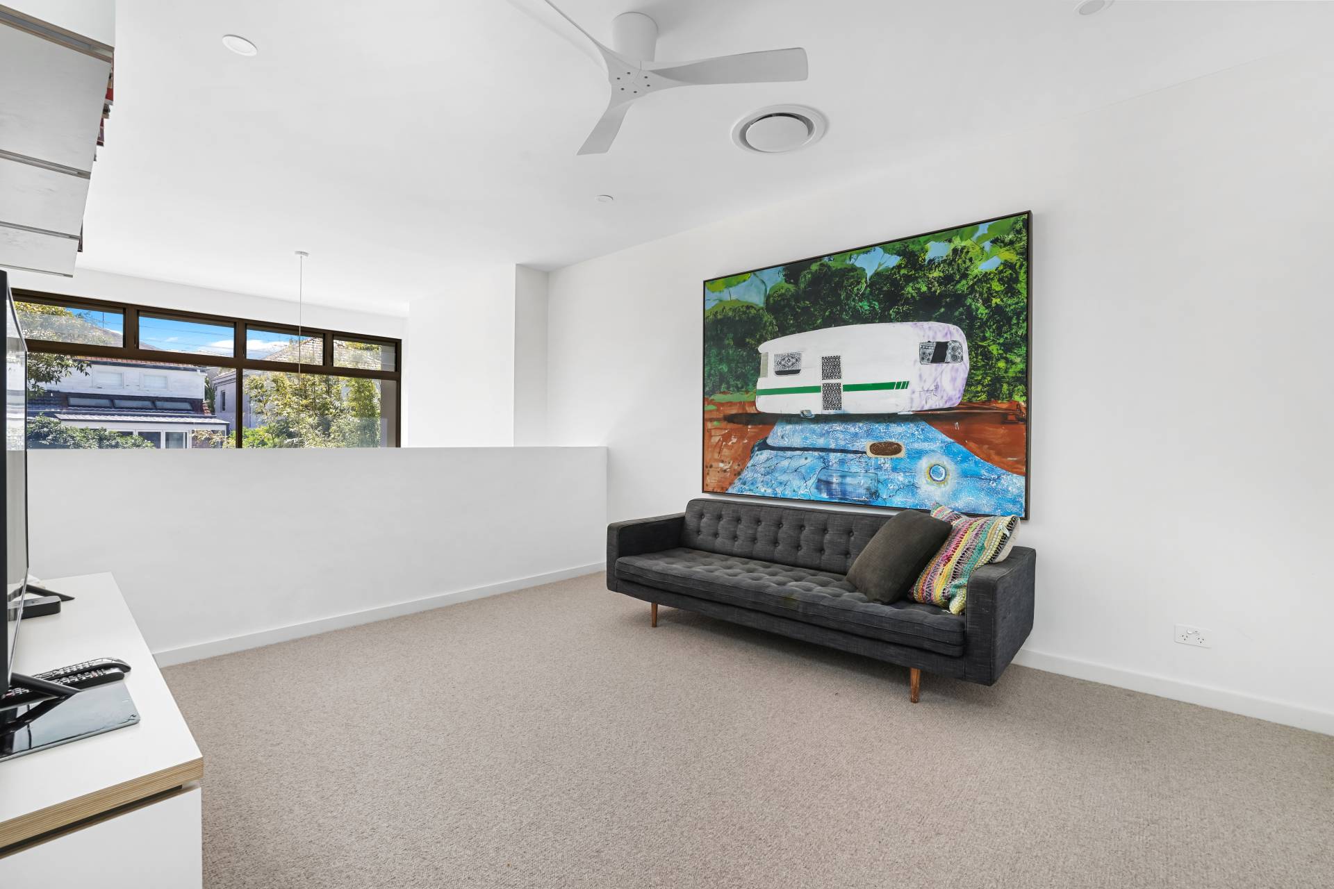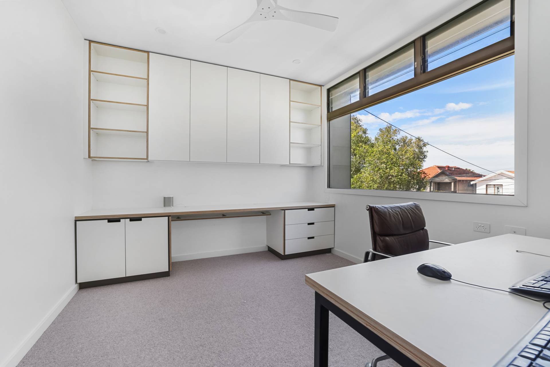 The property amenities include built-in wardrobes and ceiling fans in all bedrooms, built-in joinery in both studies, integrated Sonos speakers (including Outdoor speakers), Escea fireplace, external & internal storage, alarms + security cameras, high-speed Wi-Fi and reeded glass privacy screening.