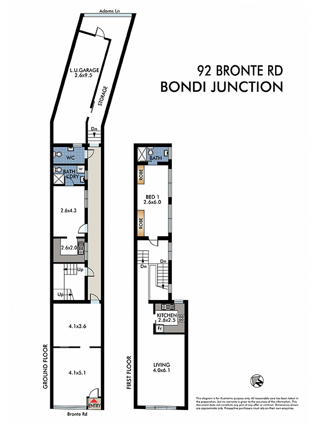 Upstairs, you will find one bedroom and one bathroom. The main bedroom is spacious and light-filled, with built-in wardrobes and beautiful views of Bronte Road. Downstairs, you will find another one bedroom apartment that could be used as additional rental income. Both apartments could also be redesigned to create a larger apartment.