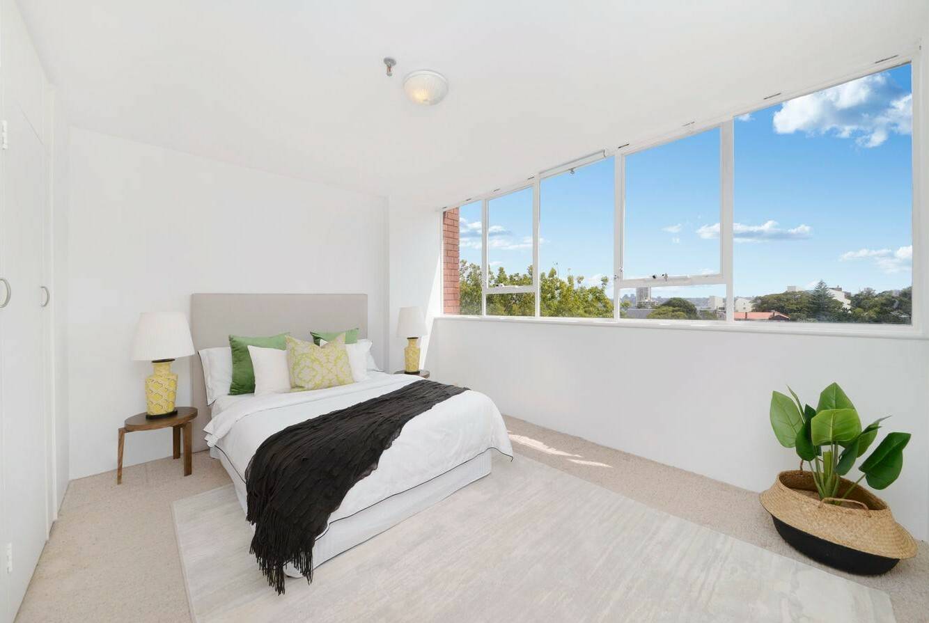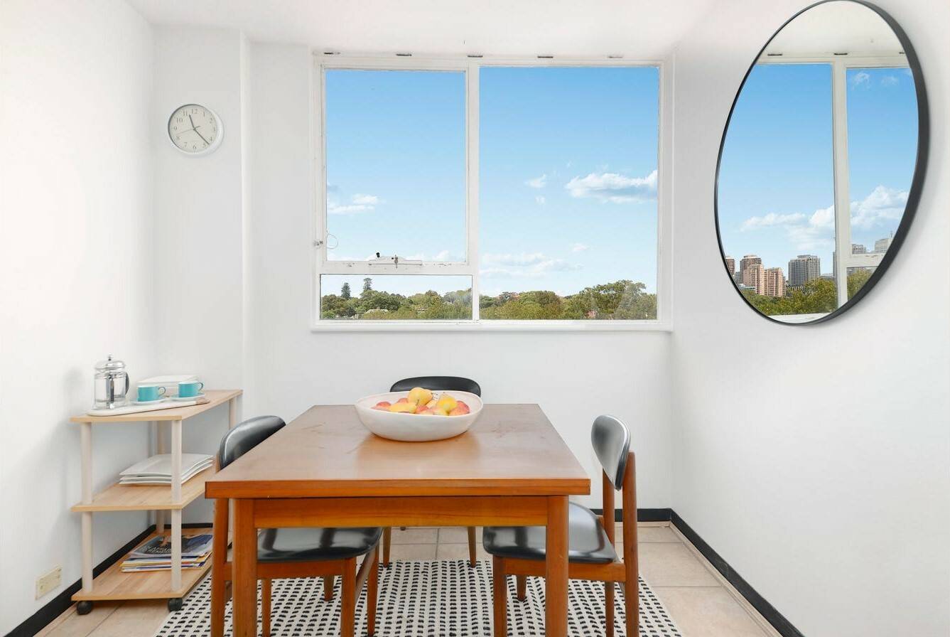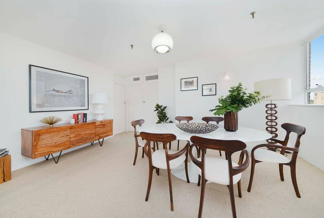 This three-bedroom apartment in Piccadilly Gardens, Woollahra, boasts stunning panoramic views from every room, surrounded by windows on all sides. Located on the seventh floor, it offers expansive views that are particularly enchanting at night