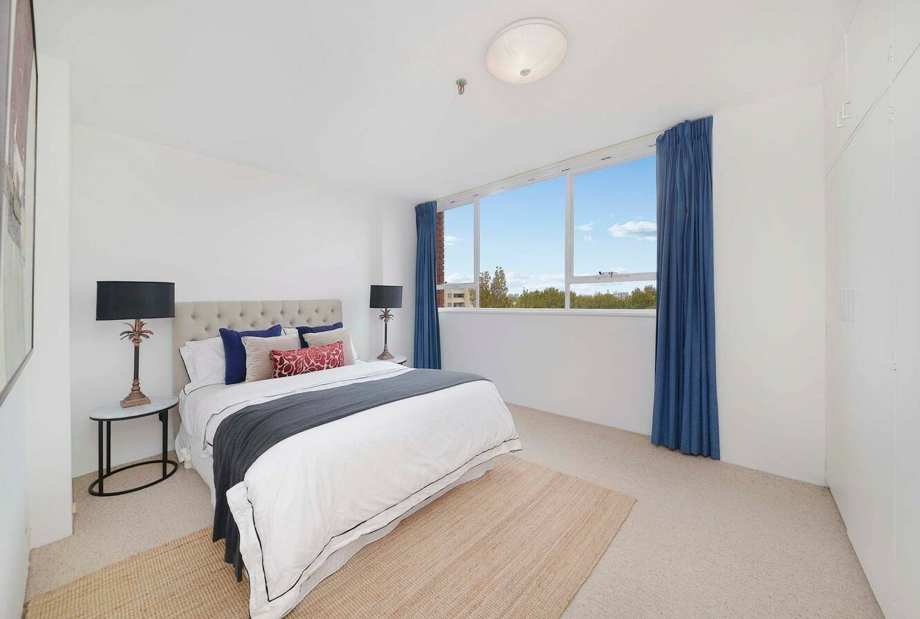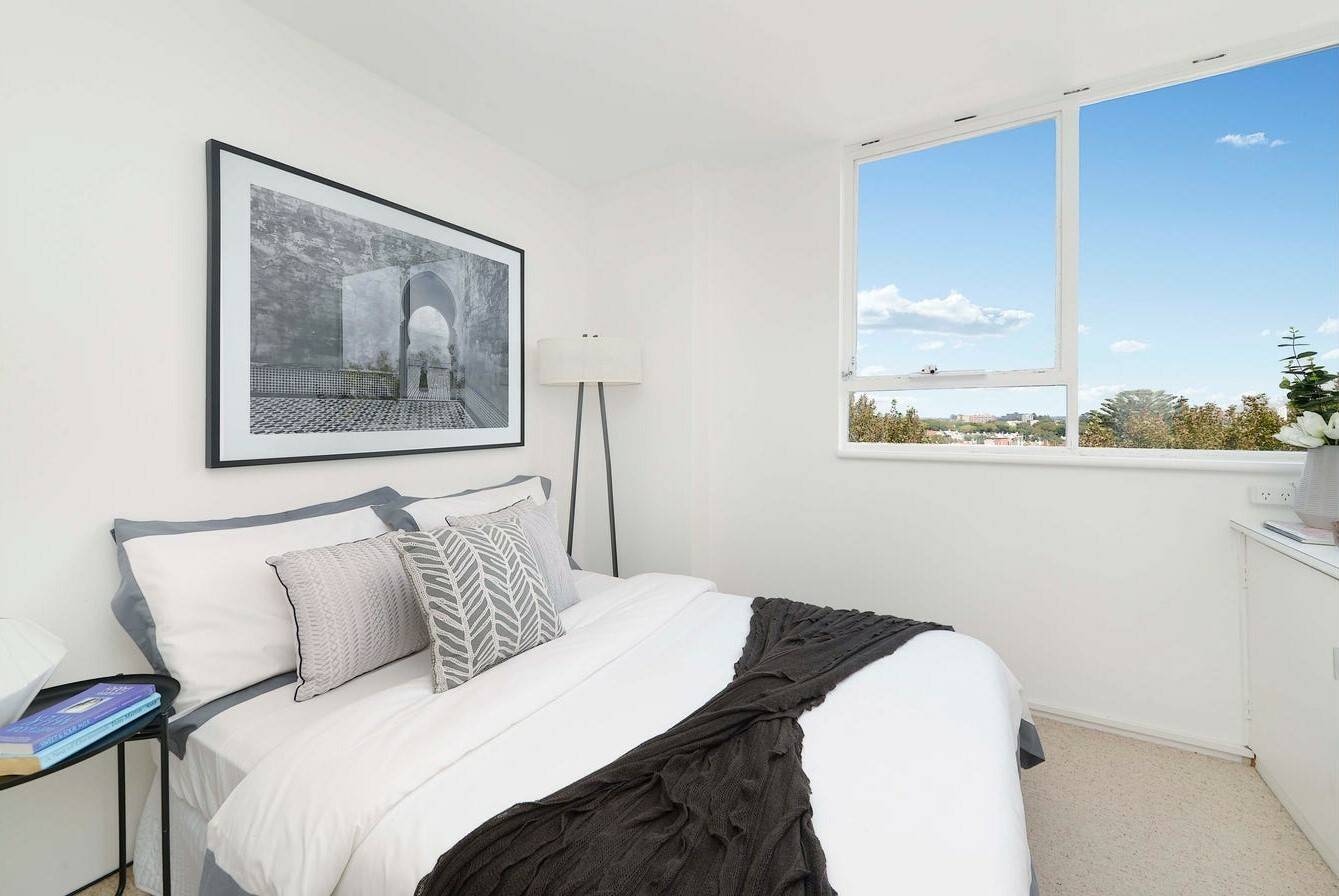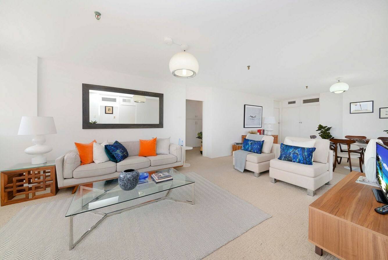 This three-bedroom apartment in Piccadilly Gardens, Woollahra, boasts stunning panoramic views from every room, surrounded by windows on all sides. Located on the seventh floor, it offers expansive views that are particularly enchanting at night