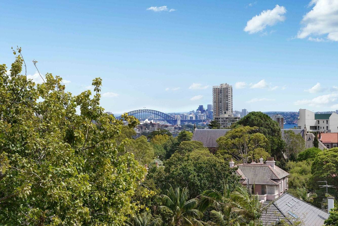 Panoramic northerly views taking in the iconic Harbour Bridge and Opera House create a captivating backdrop to this house-sized apartment with leafy outlooks from every room underlining a sense of sanctuary.