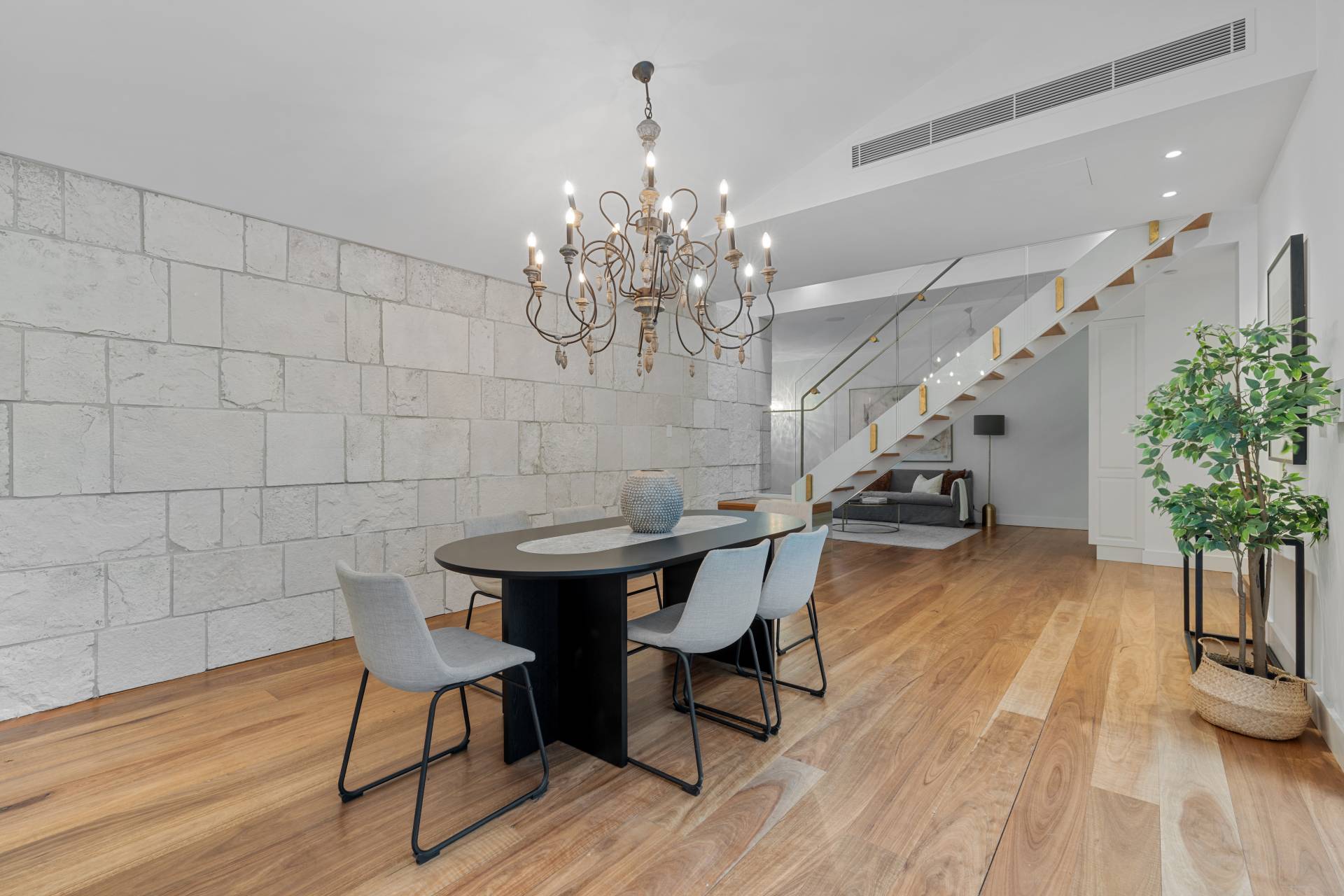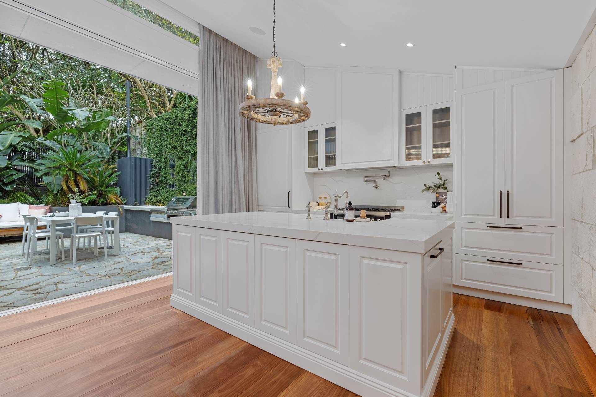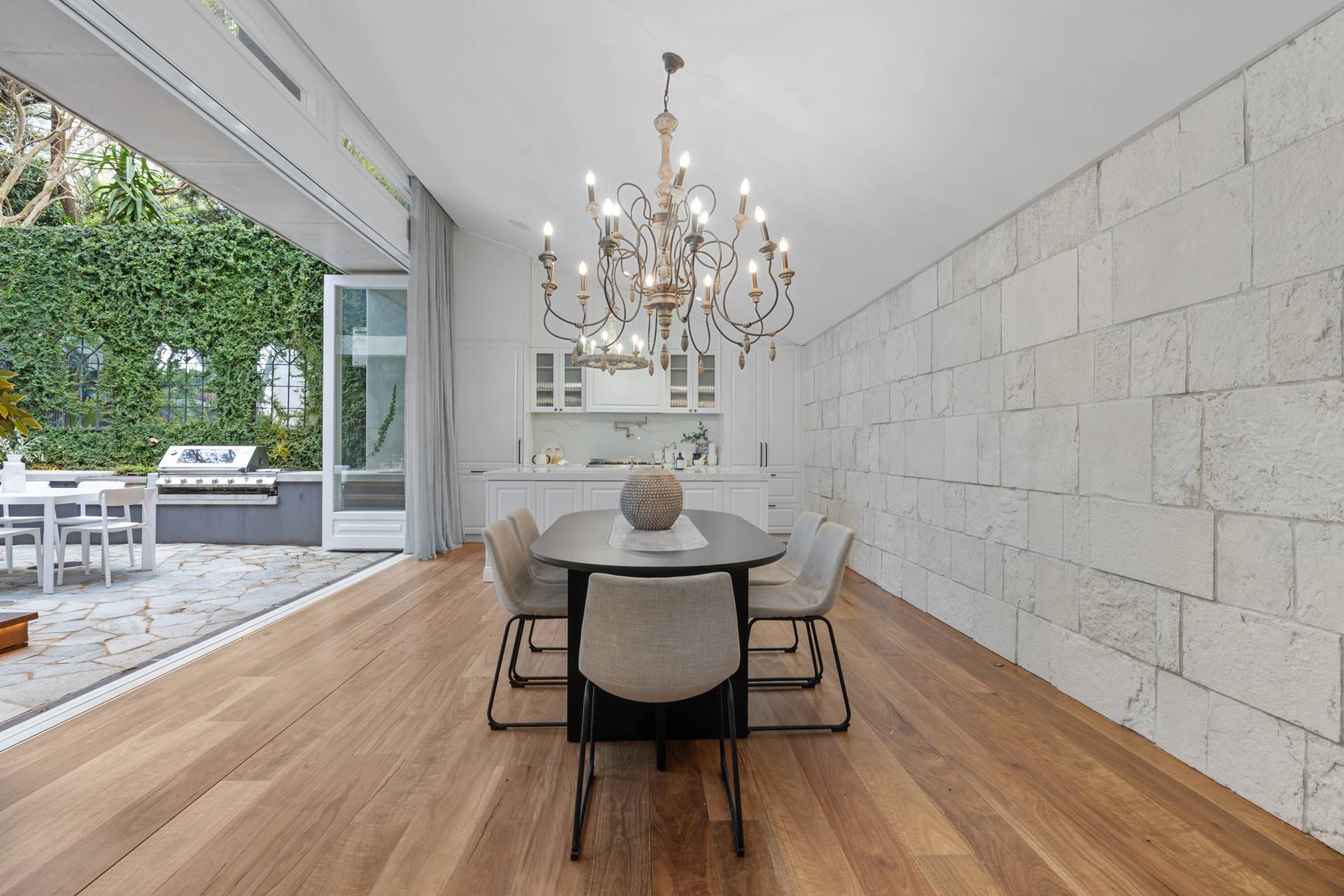 - Soaring raked ceilings, timber floors and wooden bi-fold doors
